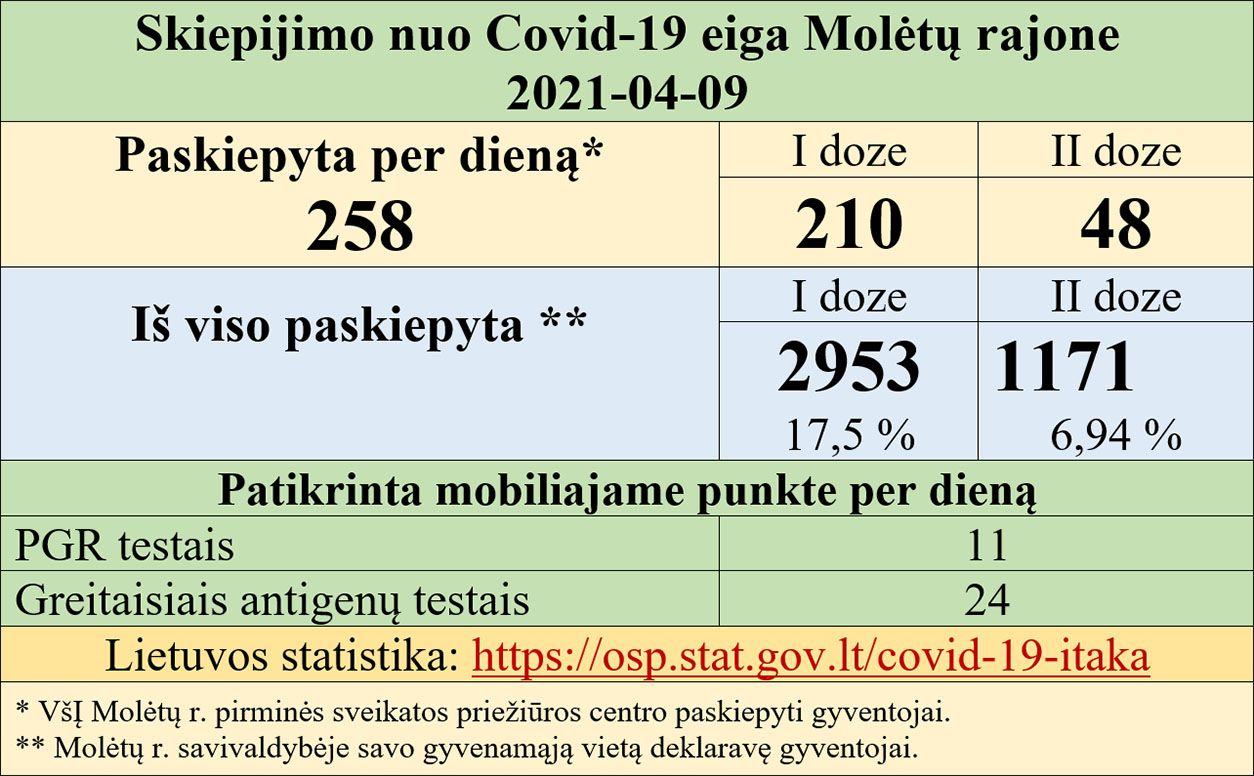 Skiepijimo koordinavimas tel. (8 383) 54780, el. p. migle.bareikyte@moletai.lt Registracija skiepytis: Molėtų mieste 8 600 94569 (poliklinikos registratūra); Seniūnijose - kreiptis į seniūnus. Paskutinis atnaujinimas: 2021-04-09 22:01:55 |