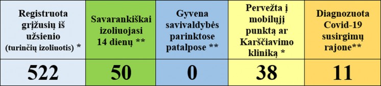 • 2 iš užsienio grįžę asmenys pradėjo savarankišką izoliaciją namuose.