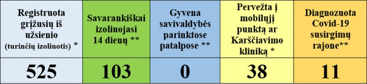 • 11 asmenų baigė savarankišką izoliaciją namuose, 1 pradėjo.