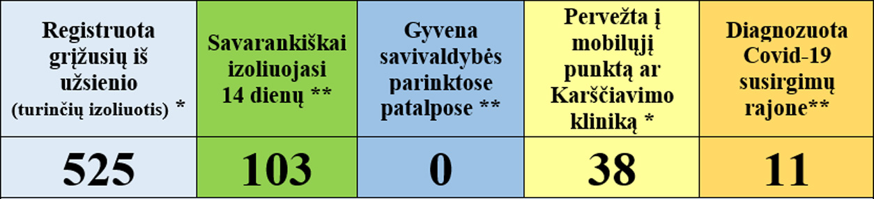 • 4 asmenys baigė privalomą 14 dienų izoliaciją savivaldybės skirtose patalpose, 1 apgyvendintas papildomai.
