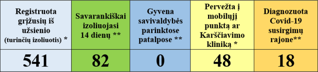 Liepos 18-19 d. - 6 iš užsienio grįžę asmenys baigė savarankišką izoliaciją namuose, 25 pradėjo.