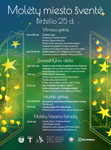 Po pertraukos į Molėtų miesto centrą sugrįžta didžioji Molėtų miesto šventė. Kaip visuomet ryški ir kupina tikrų įspūdžių, šiemet, Molėtams minint 635-ąją vardo paminėjimo sukaktį, birželio 25 dieną ji kvies kurti, puošti ir atverti žvaigždžių vartus į ežerų ir žvaigždžių miestą - Molėtus. Žmonės - miesto ir šventės kūrėjai Šventės organizatoriai molėtiškių ir miesto svečių klausia: kas jiems yra Molėtai? Ežerai, žvaigždės, molis? O gal žmonės, šypsenos, muzika, geriausi įspūdžiai ir šilčiausi atsiminimai? Viskas, kas tikra. Visa tai jau netrukus bus galima suverti į Molėtų karolius - patį prabangiausią vėrinį, ir jais papuošti simbolinius miesto vartus. Pasak šventės organizatorių, žmonės - tai, kas visus šiuos metus kuria miestą ir dėl ko norisi švęsti. Šventei susibūrę krašto keramikai šiai dienai sukurs - išdegs molio karolius, kuriuos šventės metu dekoruoti bus kviečiami visi molėtiškiai ir miesto svečiai. Šventės dalyvių rankomis išpuošti karoliai - žvaigždės, planetos, lyg vandens nugludinti akmenys, tądien susijungs į vientisą vėrinį, kuris nuguls simbolinius miestų vartus į natūralios gamtos ir kultūrinių atradimų kraštą. Kokios mintys, lūkesčiais ir linkėjimais papuoš šventinį vėrinį - geriausia dovana ir staigmena Molėtų miestui. Šventinis margumynas - renginių įvairovė Visą dieną besitęsiančių renginių gausa ir įvairovė taip pat susijungs į margą dienos vėrinį. Nuo ankstyvo ryto pagrindinėje Molėtų miesto Vilniaus gatvėje šurmuliuos didžioji mugė, šventės atidarymo ceremonijoje bus įteiktas miesto garbės piliečio vardo apdovanojimas, skambės Rytų Aukštaitijos liaudiškos muzikos ir tautinių šokių šventė „Aukštaitijos vainikas", vyks gausybė edukacijų, tarp kurių - ir didžiosios šventinės žvaigždžių arkos dirbtuvės. Čia laukiami visi norintys prisidėti prie kuriamų žvaigždžių vartų į miestą - dekoruoti vietos keramikų išdegtus molio karolius. Šalia - Molėtų viešosios bibliotekos, Etnokosmologijos muziejaus edukacijos, nemojamas Molėtų krašto muziejaus lankymas. Vakare Pastovio pakrante persikėlus į Molėtų vasaros estradą savo muziką dovanos grupės „Kitava", „Queens of Roses" ir Vidas Bareikis su grupe. Naktį vasaros estradoje palydės diskoteka po atviru dangumi (DJ Tomas Green) ir lazermeno šou programa, LED piešiniai ore. Šventės atidarymo tiesioginė transliacija birželio 25 d. 11.00 val.