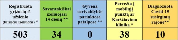 • 4 iš užsienio grįžę asmenys pradėjo savarankišką izoliaciją namuose, 2 baigė.