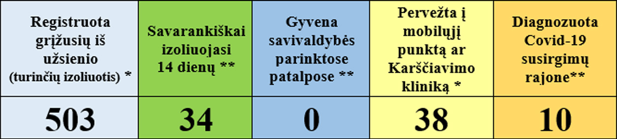 • 2 iš užsienio grįžę asmenys pradėjo savarankišką izoliaciją namuose.