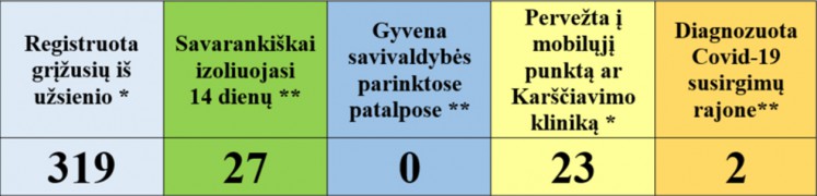 • 9 asmenys, grįžę iš užsienio, pradėjo, 4 baigė savarankišką izoliaciją namuose.
