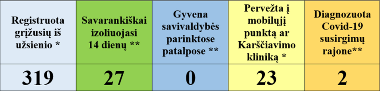 • 2 iš užsienio grįžę asmenys savivaldybės transportu atvežti iš Vilniaus oro uosto, 1 iš Klaipėdos uosto.