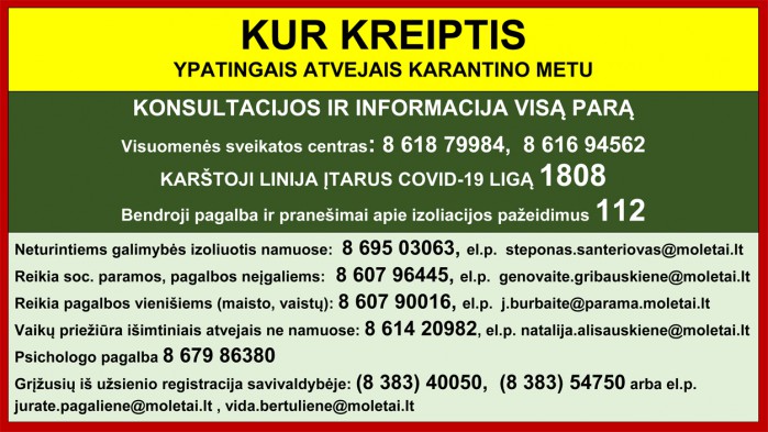 Kviečiame asmenis, karantino metu turintiems būti izoliuotiems namuose ar kitoje gyvenamojoje vietoje susipažinti su šiomis atmintinėmis ir laikytis jose nurodytų sąlygų. Su šia informacija taip pat kviečiame susipažinti artimuosius, gimines ar draugus, padedančius asmenims būti izoliacijoje ar gyvenantiems greta.