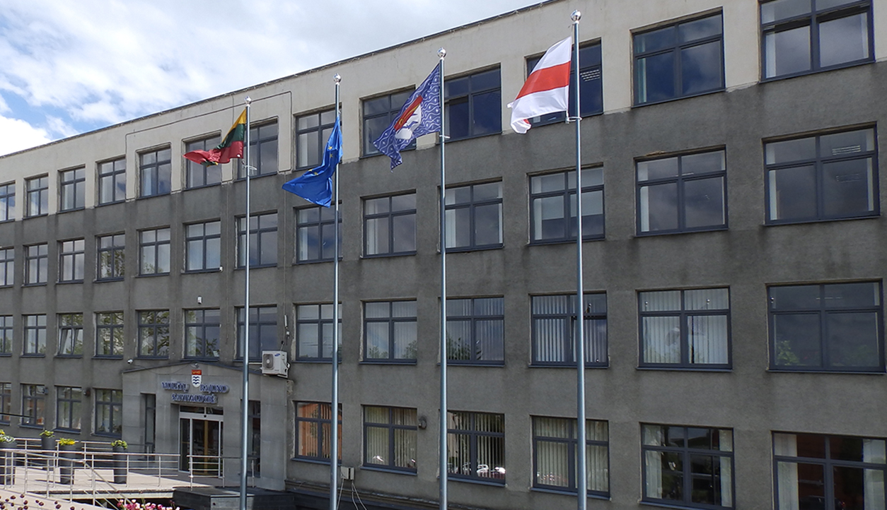 | Prie Molėtų savivaldybės iškelta istorinė Baltarusijos vėliava - demokratinių jėgų palaikymo ženklas |