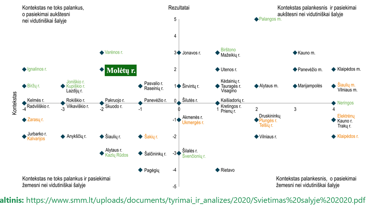 | Rajono viešojoje erdvėje kartais pasigirsta nuogąstavimų dėl mūsų mokyklų švietimo kokybės, kokio nors vieno atvejo pagrindu kritikuojamos mokyklos dėl neva menkų pasiekimų. Tokios manipuliacijos ne tik neatitinka tikrovės, bet daro ir neigiamą įtaką mokytojų reputacijai, mokyklų prestižui. Kaip yra iš tikrųjų? Prieš gerą pusmetį Nacionalinė švietimo agentūra išleido Švietimo, mokslo ir sporto ministerijos parengtą leidinį „Švietimas šalyje ir regionuose 2020" . Tai pats naujausias faktais ir duomenimis pagrįstas švietimo padėties Lietuvoje apibendrinimas, savotiškai „momentinė" švietimo nuotrauka. Bendrą švietimo būklės savivaldybėse paveikslą pateikia ši diagrama: Konteksto ( horizontalioje) ašyje visos savivaldybės pagal socialinius, ekonominius ir kultūrinius rodiklius surašomos į eilę nuo - 4 iki + 4, t.y. nuo nepalankaus iki labiau palankaus ugdymui konteksto. Kontekstas matuojamas pagal kelis rodiklius: mokinių skaičiaus pokytį, bedarbių dalį savivaldybėje, vidutinį darbo užmokestį ir nemokamai maitinamų mokinių dalį. Paprastai kalbant, tai savivaldybėms būdingos socialinės- ekonominės aplinkybės, tiesiogiai nepriklausiančios nuo švietimo, bet darančios įtaką jam. Molėtų rajonas priskiriamas ne tokio palankaus konteksto savivaldybių grupei, jo rodiklis yra -2. Nepalankaus konteksto ašyje yra 26 savivaldybės. Rezultatų (vertikalioje) ašyje savivaldybės surikiuojamos nuo - 5 reikšmės iki + 5 , t. y. nuo prasčiausių rezultatų iki aukščiausių pasiekimų. Rezultato rodiklis yra kompleksinis, jį sudaro apibendrintas valstybinių brandos egzaminų rodiklis, pasiekusių bent pagrindinį pagrindinio ugdymo pasiekimų patikrinimo lygį mokinių dalis, dalykų olimpiadų ir konkursų prizininkų skaičius; mokinių, kurie mokykloje jaučiasi gerai, dalis ir pažangą padariusių 6 klasės mokinių dalis. Taigi rezultatai iš esmės apibūdina savivaldybės švietimo kokybę. Pagal šiuos rezultatus Molėtų rajono mokyklos priklauso tai grupei savivaldybių, kuriose pasiekimai yra aukštesni nei vidutiniškai šalyje, nors kontekstas yra ne toks palankus. Šioje grupėje yra 13 savivaldybių, o Molėtai ( žalia spalva žymi pažangą, o oranžinė spalva reiškia rezultatų suprastėjimą) išskirti kaip savivaldybė, kurioje per metus - nuo 2018 iki 2019 metų - ugdymosi rezultatai reikšmingai pagerėjo bent 2 vienetais. Toks Molėtų rajono mokyklų rezultatas, esant mažiau palankiam kontekstui, rodo mokyklų veiklos efektyvumą ir mokytojų pastangomis kuriamą aukštą pridėtinę vertę. Dar 13 savivaldybių taip pat priskiriamos nepalankaus konteksto grupei, bet rezultatai yra žemesni nei vidutiniškai Lietuvoje. Kitos savivaldybės yra priskiriamos palankesnio konteksto grupėms, bet vienoje grupėje ( 15 savivaldybių) pasiekimai žemesni nei vidutiniškai šalyje, ir tik antroje grupėje ( 18 savivaldybių) pasiekimai yra aukštesni nei vidutiniškai Lietuvoje. Taigi Molėtų mokyklos yra iš 31-os savivaldybės grupės, kur mokinių pasiekimai yra aukštesni nei vidutiniškai Lietuvoje. O rezultato rodiklis + 2 , be Molėtų, dar fiksuojamas 4 savivaldybėse, +3 lygis 5 savivaldybėse, +4 nėra nei vienos, o +5 reikšmę pasiekusi tik viena savivaldybė. Taigi vienerių metų „momentinė" švietimo nuotrauka džiuginanti: Molėtų rajono mokyklas pagal suminį pasiekimų rezultatą lenkia tik 6 savivaldybės. Tokį švietimo būklės palyginimą sudaro daug rodiklių, todėl, pasikeitus nors vieno reikšmei, galime gauti šiek tiek kitokį paveikslą. Natūralu, kad dėl daugelio veiksnių atskirais metais tos reikšmės keičiasi. Tačiau svarbu tai, kad mūsų mokyklų potencialas yra toks, kad jos pagal savo mokinių pasiekimus neatsilieka nuo geriausių standartų. Paskutinis atnaujinimas: 2021-03-30 15:40:08 |