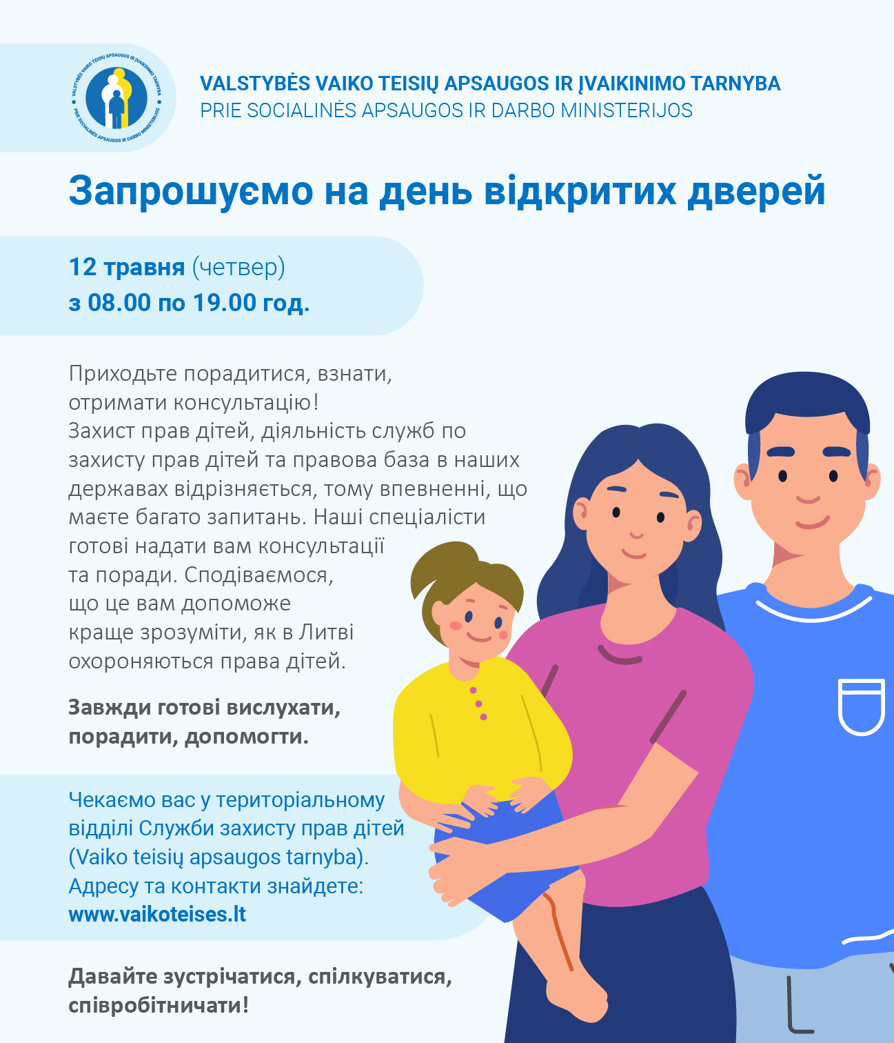Atvirų durų dieną Tarnyboje laukiami ir Ukrainos žmonės, kurie kviečiami susipažinti su šalyje veikiančia draugiška ir saugia vaiko teisių užtikrinimo sistema.